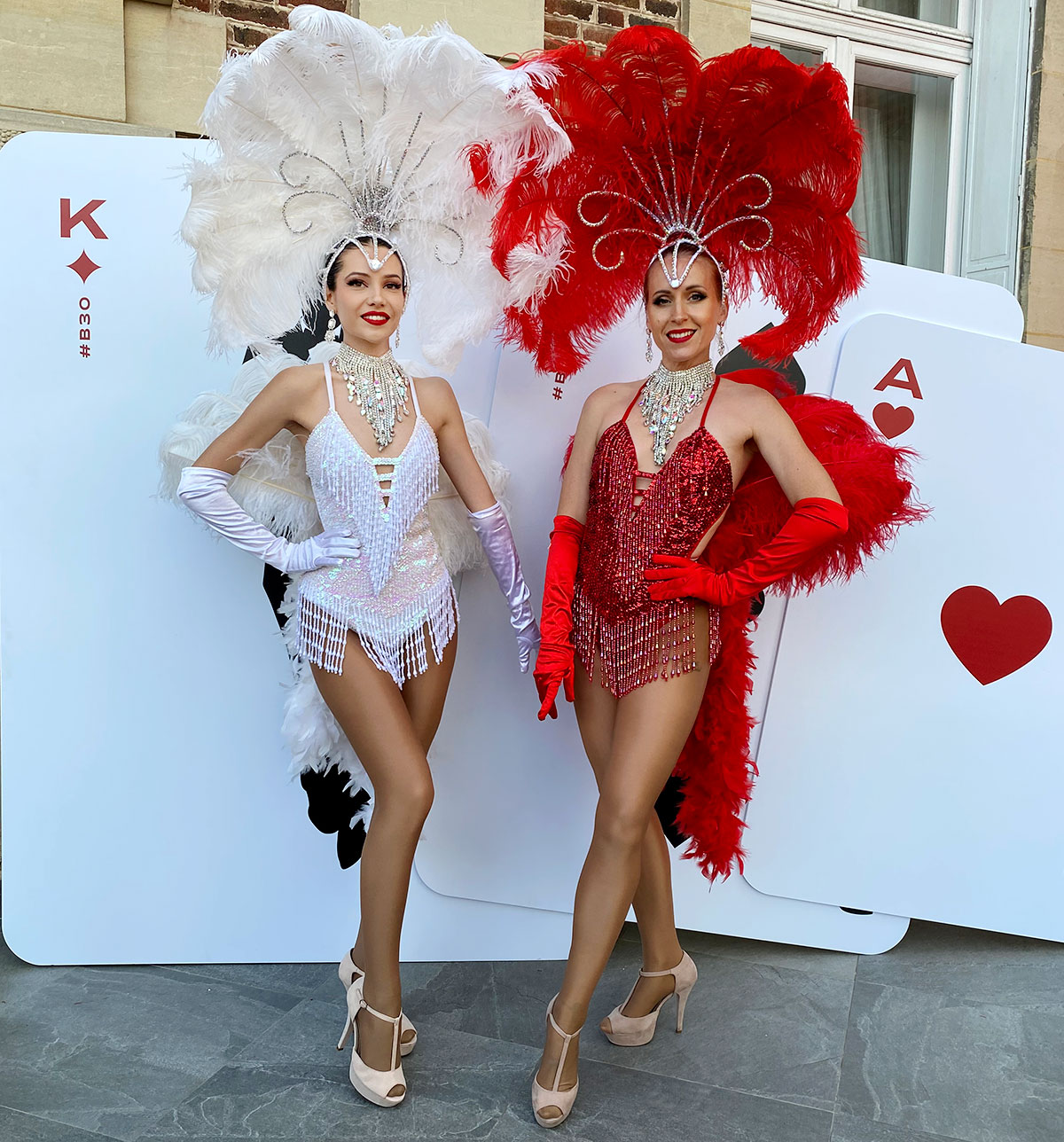 Par ailleurs, pour un accueil encore plus spectaculaire, dans le but d'apporter de la hauteur à votre événement, pensez aux échassières avec les costumes Showgirl à plumes. Au fur et à mesure elles se déplaceront dans la salle et poseront avec les invités. Toutefois, il est nécessaire de prévoir une hauteur sous plafond supérieur à 2,80m. A savoir également, une surface plate est obligatoire. Enfin, plus de photos des échassières disponibles sur ce lien.