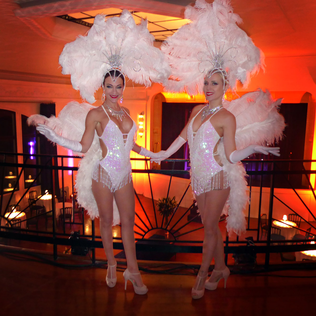 Par ailleurs, pour un accueil encore plus spectaculaire, dans le but d'apporter de la hauteur à votre événement, pensez aux échassières avec les costumes Showgirl à plumes. Au fur et à mesure elles se déplaceront dans la salle et poseront avec les invités. Toutefois, il est nécessaire de prévoir une hauteur sous plafond supérieur à 2,80m. A savoir également, une surface plate est obligatoire. Enfin, plus de photos des échassières disponibles sur ce lien.